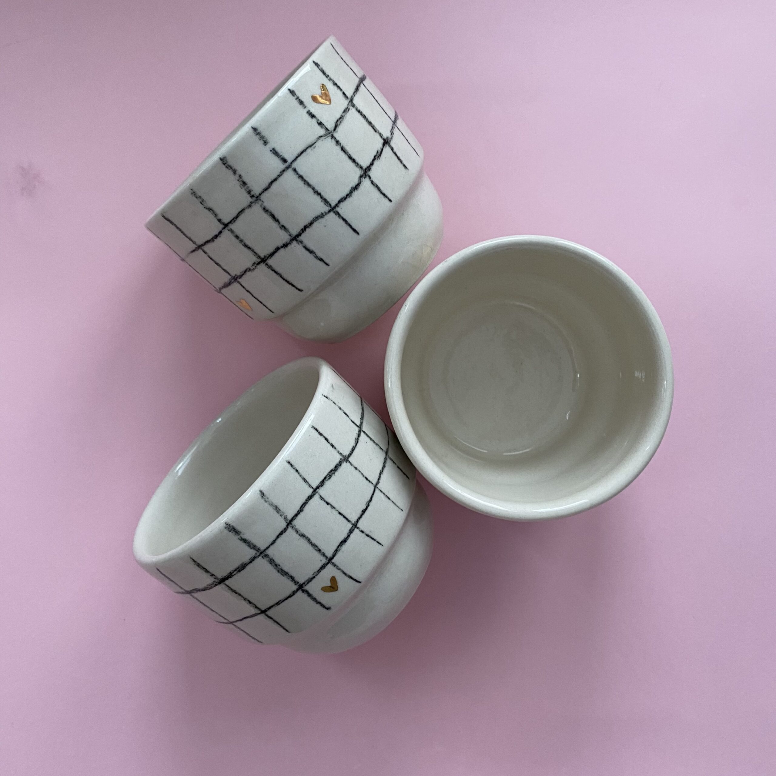 Kubek ceramiczny w dekoracji kredką i złotem. Ze złotem, które nie lubi zmywarki, lepiej ręcznie. Wysokość 7 cm, pojemność 200 ml