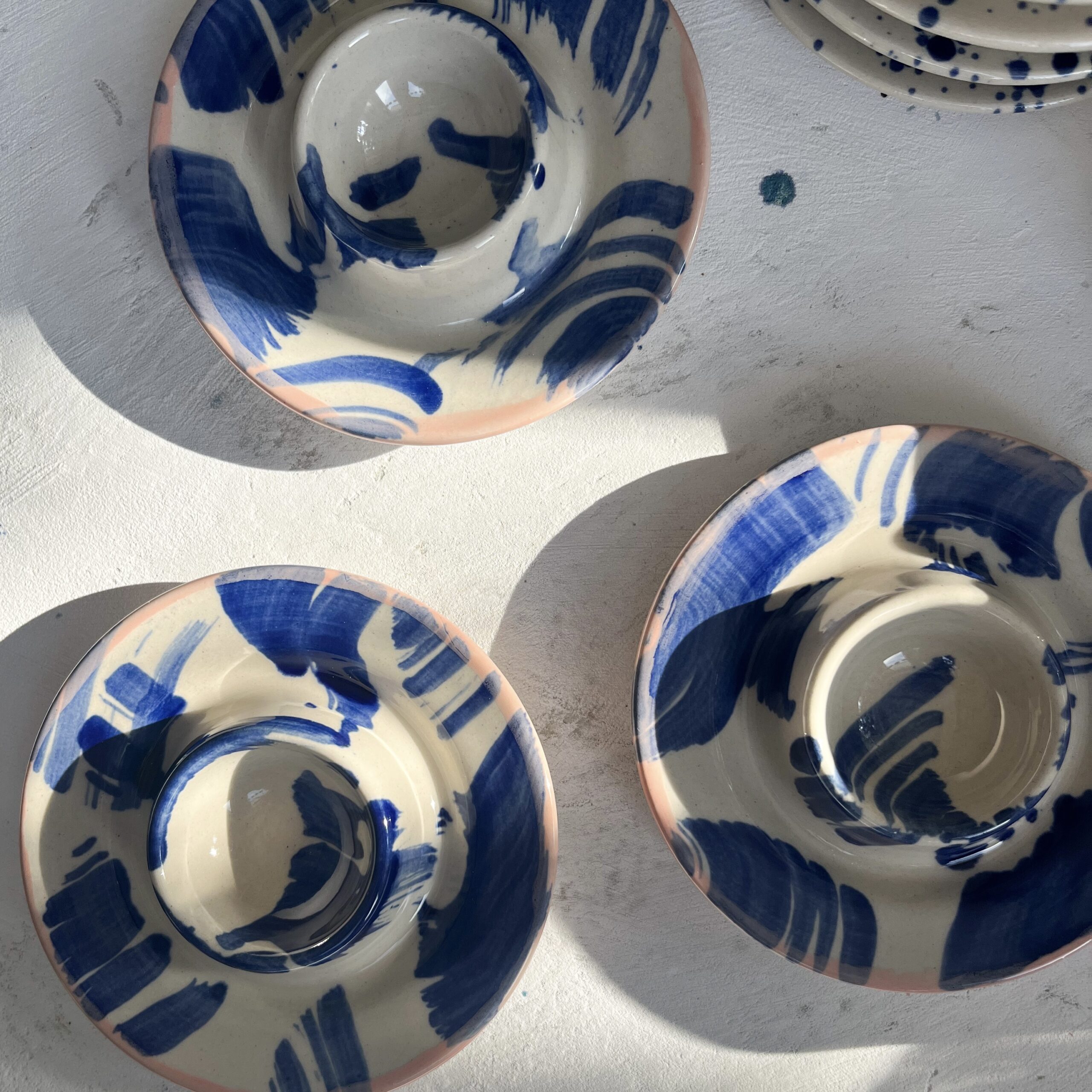 Okrągła podstawka na jajko, z rantem. W dekoracji kobaltowymi ciapkami.